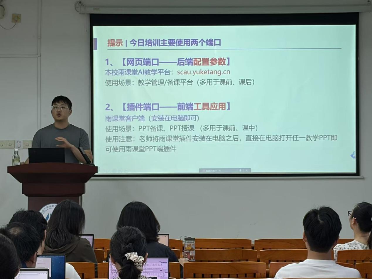 培训中,技术人员以“AI赋能教师教学提质增效”为主题,详细讲解了雨课堂使用方法,并现场指导教师进行工具安装、建课和互动操作。在技术人员的“手把手”教学下,老师们亲自体验了雨课堂多种AI赋能工具功能。